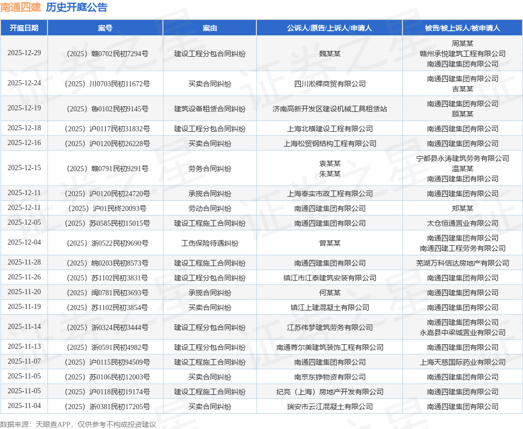 依据计算,近一年内以南通四建集团有限公司为当事人的前史开庭公告有583则,其间案由为“建造工程项目施工合同纠纷”的公告以169则居首,其次为“生意合同纠纷”有119则,“建造工程分包合同纠纷”有59则。前史开庭公告(前20条)如下:
